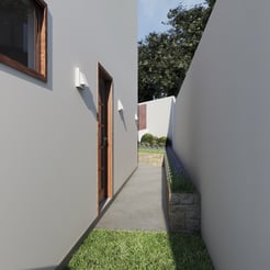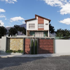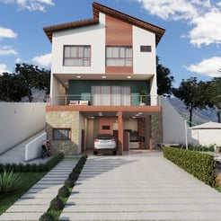 Projeto arquitetônico e de interiores com fachada e área externa.